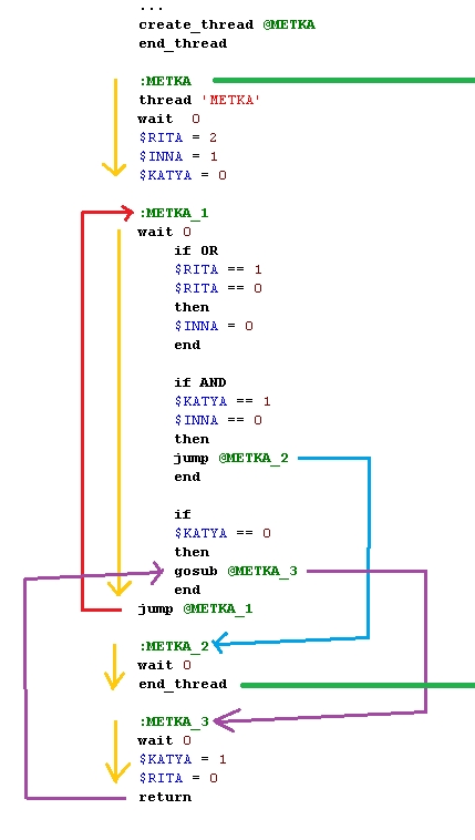 В нашем случаи это будет тогда, когда переменные "$KATYA" и "$INNA" будут равны 1 и 0 соответственно, причём одновременно! Как видим, пока эти условие не выполняются, так как в них разные значения. Смотрим дальше скрипт. Видим "gosub" на метку ":METKA_3". А условие, при котором будет прыжок выполняется. Значит прыгаем на метку, в корой изменяются значение переменных "$KATYA" и "$RITA". Как видим для завершения скрипта нам необходимо, что бы ещё переменная "$INNA" была равна нулю. Как видим пока она не равна, значит условие не выполняется и мы дальше продолжаем скрипт.