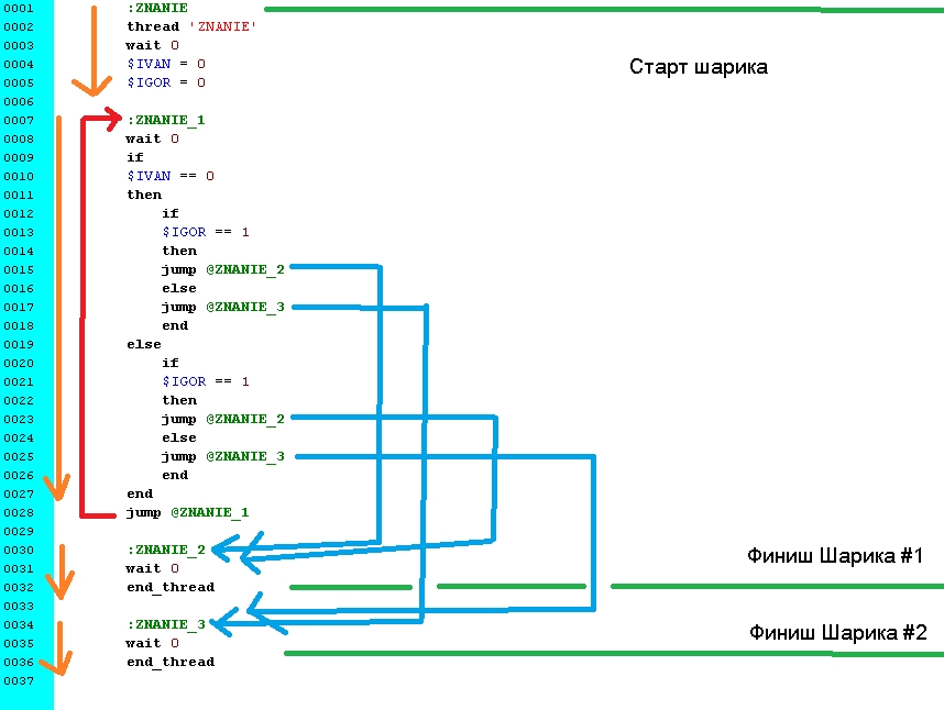 :ZNANIE thread 'ZNANIE' wait 0 оценка 0, то есть нустота, в Иванова нет оценки первоначальный этам знания мы написали, что равен нулю :ZNANIE_1 wait 0 if решил ли он задачу then если да, то оценка 5 else если нет, то оценка 2 end end_thread // конец потока