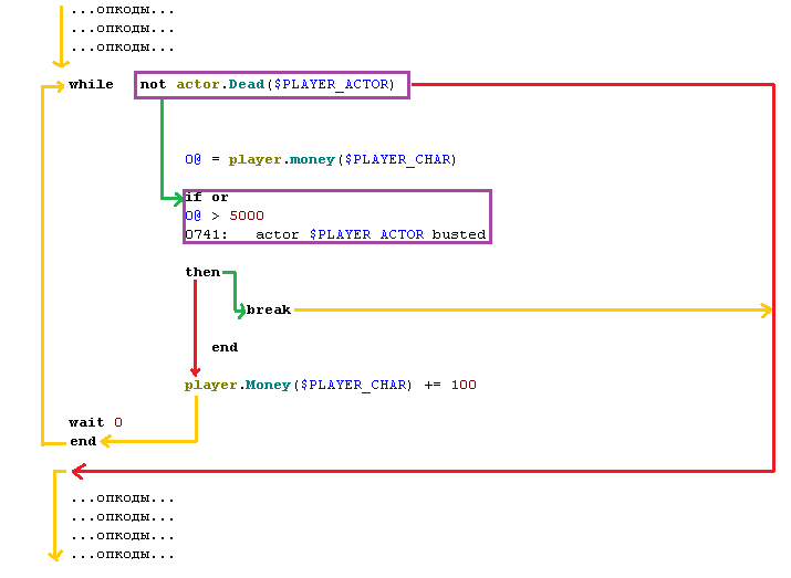 Данный скрипт будет постоянно давать СЖ деньги. Если он умрёт, то осуществится выход с цикла. И тут появилось ещё одно условие: если деньги СЖ превышают 5000, то мы принудительно завершаем цикл и не важно СЖ жив или мёртв. Таким образом мы сделали два выхода с цикла.