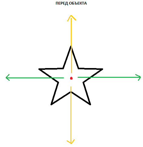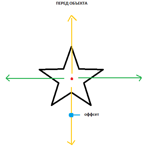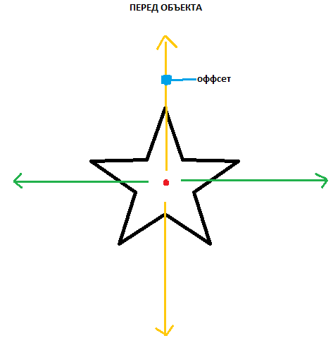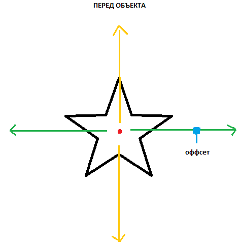 Давайте рассмотрим координаты относительно объекта ( оффсеты ) "offset_from_object 0.0 0.0 0.0". Допустим в нас есть объект-звезда. Так и или иначе в неё есть перед ( место, куда "смотрит" объект ). Назовём это место "перёд объекта". Естественно у объекта есть центр. Это будет точка. На рисунке она обозначена красным цветом.