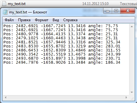 0AD9: write_formatted_text "Pos: %.4f %.4f %.4f angle: %.2f%c%c" in_file 0@ 1@ 2@ 3@ 4@ 0xD 0xA0xD 0xA - это и есть те коды, которые делают переход на новою строку, в конце строки прописываются как идентификатор символа ( %c). Давайте обновим наш скрипт: