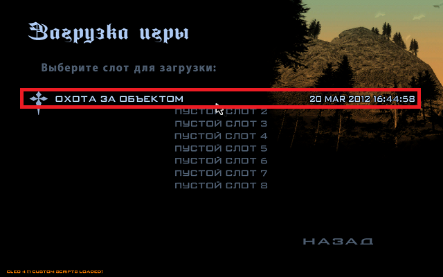 Когда мы прошли миссию и сохранились, то при попытке загрузки игры мы увидим текст который заменяет предыдущий текст миссий. Если раньше при загрузке миссии нам писало "В самом начале", то теперь мы увидим название текста, содержащийся в FXT-записи: "Охота за объектом", который был показан в начале миссии: