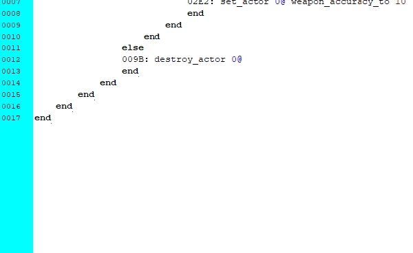 endМы опять сократили код и избавились от блоков "ELSE". Первое условие в коде позволяет не выполнять код ниже (ключевое слово "continue"), если оно равно "false". Это позволило нам избавится от лишних разветвлений в блоке с условием "0@ == 0". В блоке кода с условием "0@ == 3" действия блока "ELSE" фактически являлись изначальными данными, поэтому их легче написать после опкода 077E.