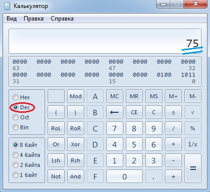 Всё верно! Комбинация битов в результате вычисления на калькуляторе совпало с нашим числом - 75!
