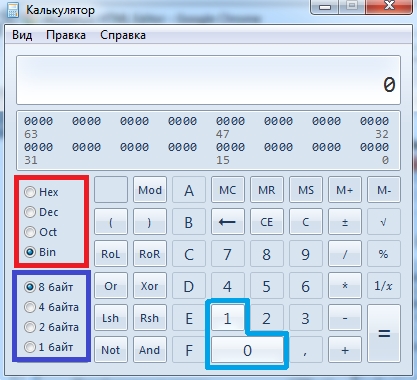 Выберите "8 байт" на панели и установите чекбокс на "BIN". Теперь для ввода цифр в нас доступно только цифры 0 и 1: