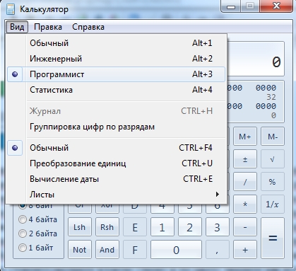 Запустите калькулятор на вашем ПК. Выберите пункт "Вид->Программист".