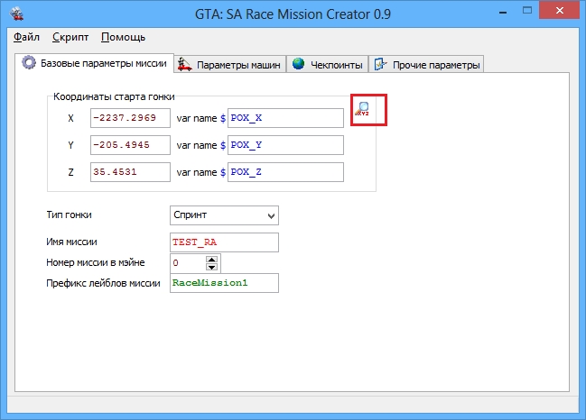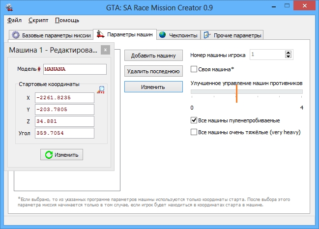 Тип гонки пусть будет - Спринт. Имя миссии - это название потока. Укажем TEST_RA. Так, как мы будем делать миссию для Cleo, то Номер миссии в мэйне указывать не нужно. Перейдём во вкладку "Параметры машин". Здесь мы будем добавлять наш транспорт. Для этого нужно в игре сесть в какую-то машину и занять позицию, где должна она находится при старте и определим её координаты и модель, нажав на кнопку "Добавить машину":