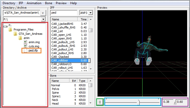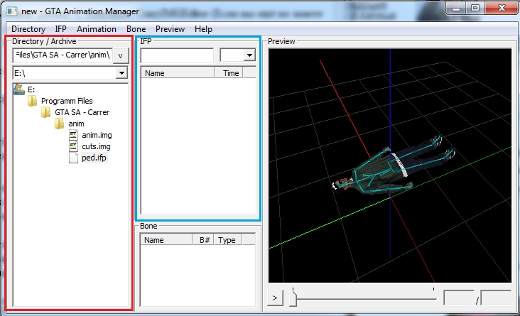 Райдер загружен, теперь давайте заставим его выполнять какие то анимации. Видим вкладку Directory/Archive, нажимаем v (выделено красным), и указываем папку с игрой, а конкретнее папку "Игра\anim" (выделено синим). Мы видим три файла: "anim.img", "cuts.img" и "ped.ifp". Именно в этих файлах сохранены игровые анимации. Сделаем двойной клик по последнему. Видим на экране есть изменения.