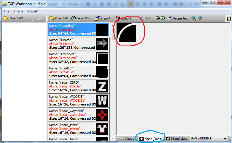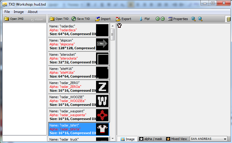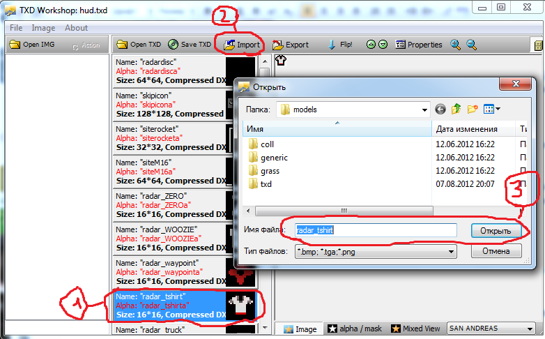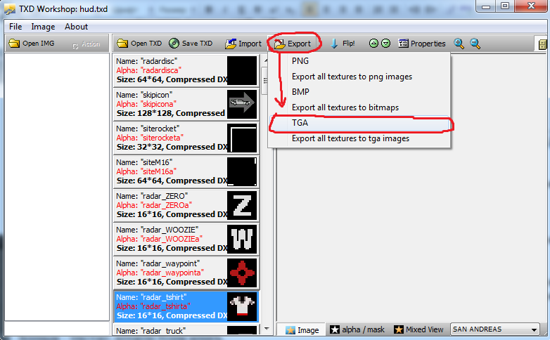 Можно сохранять в 3-х разных типах: "PNG", "BMP" и "TGA". Ещё видно 3 функции, которые сохраняют все файлы с txd-архива, с соответствующими типами. Давайте извлечем футболку под названием "radar_tshirt". Выделим её и нажмем кнопку Export->TGA и указываем где её сохранить. Теперь редактируем картинку в любом доступном графическом редакторе.