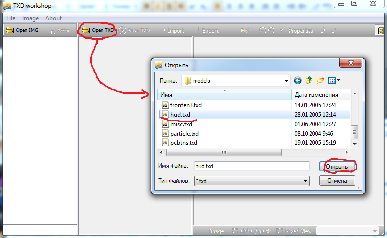 Для примера я взял английскую версию, но в интернете Вы можете найти и русскую. Взял эту, так как она более-менее стабильна. Давайте откроем какой-нибудь архив текстур, например: "hud.txd". Откроем её. Для начала нажмите OPEN TXD и укажите путь к нашему "hud.txd" (Игра\models\hud.txd):