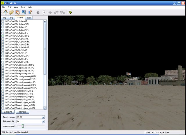 Нам нужен Гроув Стрит, который находится в файле "lAE2.IPL". Ставим птичку напротив этого пункта и жмём кнопочку Render. МЕд начнет подгружать карту, и, как только он сделает это, мы увидим следующее: