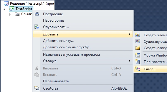 После небольшой паузы наш проект готов к использованию. Что бы мы могли писать код скрипта, нам необходимо добавить в проект Класс. Делается это следующим образом: на имени проекта нажимаем правую кнопку мыши и выбираем Добавить->Класс: