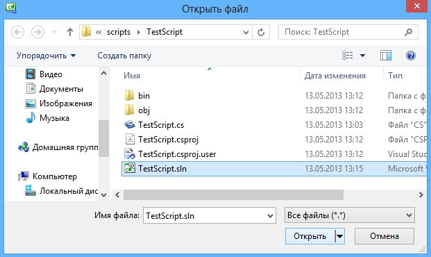 Как же открыть, созданный ранее, проект? Очень просто! Идём в меню Файл->Открыть проект и переходим в папку, где мы сохранили код. Выбираем файл с расширением *.sln: