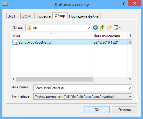 Первым шагом будет подключения необходимых библиотек для работы. В обозревателе решений выделим папку "Ссылки". Нажимаем ПКМ->Добавить ссылку.... В появившемся окне выбираем вкладку "Обзор" и ищем в нём файл "ScriptHookDotNet.dll". Он лежит в папке